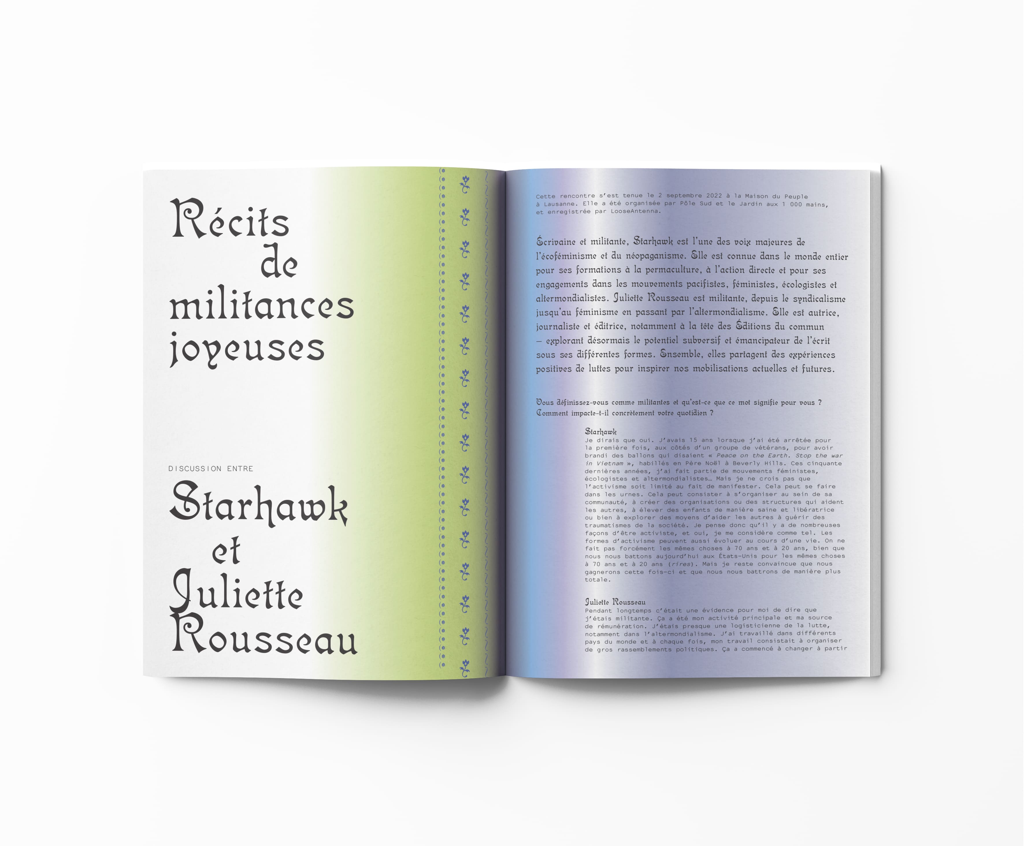 Avec : Starhawk, Fanny Lallart, Alexis Pauline Gumbs, Naïa Combary, Romy Alizée, Maëlis Bekkouche, Leï Barkaoui, Le Poète Lune, Myriam Bahaffou, Audrey Couppé de Kermadec, Emma Neame, Sayak Valencia, Manon Schaefle, Marilou Bal, Eva Tapiero, Juliette Rousseau, Caroline Bonfond, Manel Ben Boubaker, Donna Haraway, Bettina Zourli, Rose-Mahé Cabel, Youri Johnson, Marine Forestier, Camille Bernard.