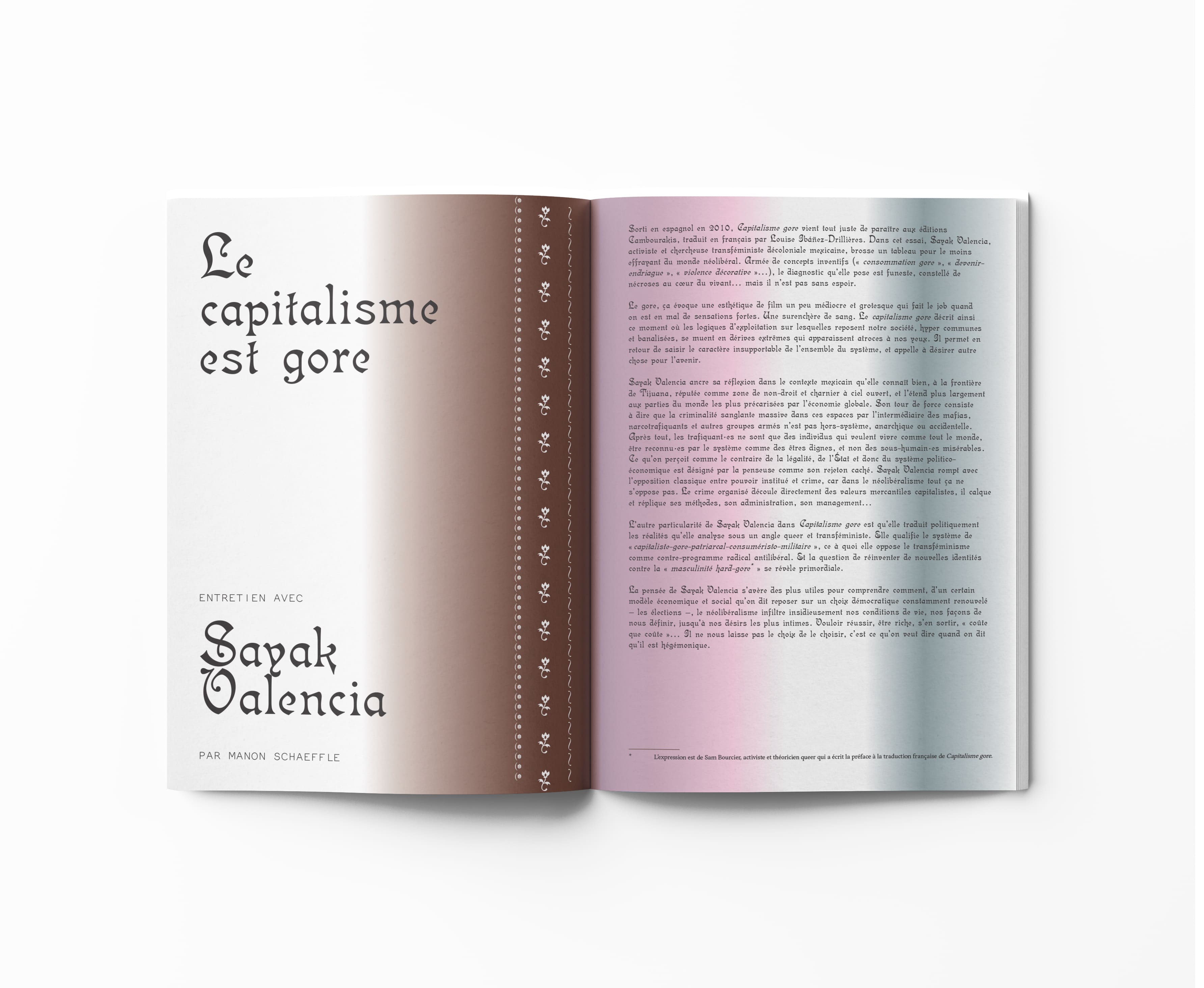 Cette édition parle d’écologie. Ses analyses, textes libres, poèmes, entretiens et productions artistiques mènent à une conclusion : l’urgente nécessité de faire front commun pour quitter les logiques d’exploitation hyperviolentes envers la terre, les espèces et les existences les plus vulnérables. Il est question de militances joyeuses et du refus de la fatalité, d’amour dans les champs brûlés, de spiritualités noires et d’écolier·es en cavale, d’écologie au quotidien, de capitalisme gore et de futurs possibles.