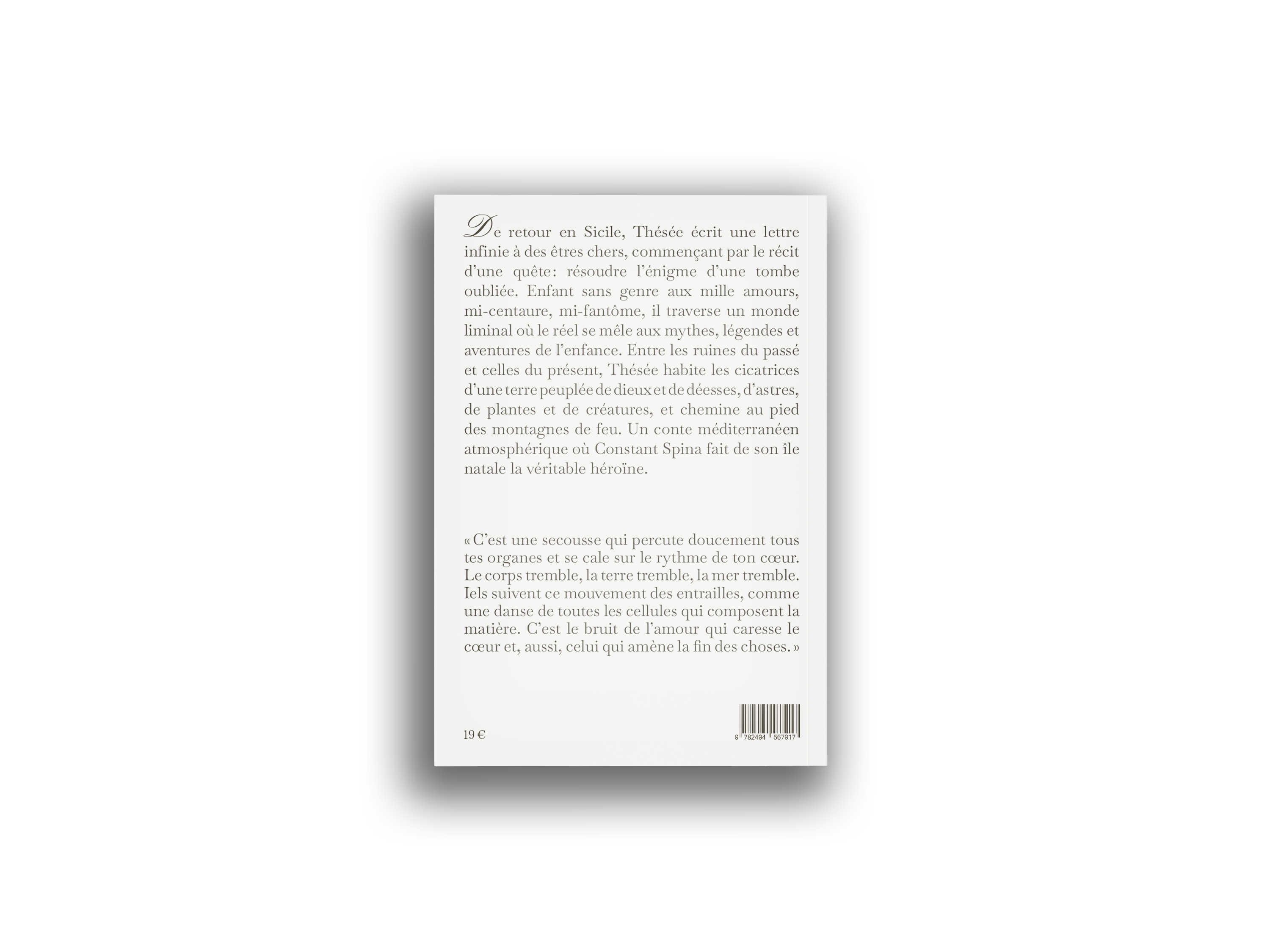 De retour en Sicile, Thésée écrit une lettre infinie à des êtres chers, commençant par le récit d’une quête : résoudre l’énigme d’une tombe oubliée. Enfant sans genre aux mille amours, mi-centaure, mi-fantôme, il traverse un monde liminal où le réel se mêle aux mythes, légendes et aventures de l’enfance. Entre les ruines du passé et celles du présent, Thésée habite les cicatrices d’une terre peuplée de dieux et déesses, d’astres, de plantes et de créatures, et chemine au pied des montagnes de feu. Un conte méditerranéen atmosphérique où Constant Spina fait de son île natale la véritable héroïne.