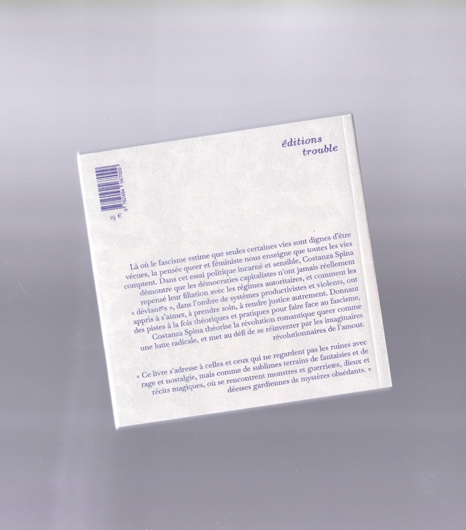 Là où le fascisme estime que seules certaines vies sont dignes d’être vécues, la pensée queer et féministe nous enseigne que toutes les vies comptent. Dans cet essai politique incarné et sensible, Constant Spina démontre que les démocraties capitalistes n’ont jamais réellement repensé leur filiation avec les régimes autoritaires, et comment les « déviant·es » dans l’ombre de systèmes productivistes et violents ont appris à s’aimer, à prendre soin, à rendre justice autrement. Donnant des pistes à la fois théoriques et pratiques pour faire face au fascisme, Constant Spina théorise la révolution romantique queer comme une lutte radicale, et met au défi de se réinventer par les imaginaires révolutionnaires de l’amour.