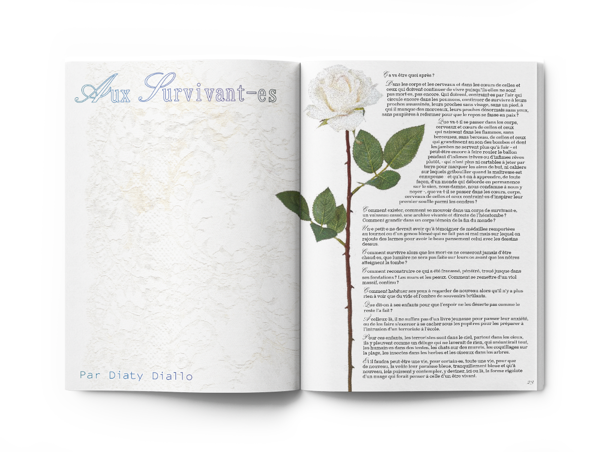 Un texte profondément poignant dans lequel Diaty Diallo interroge le sens de l’avenir pour les Palestinien·nes ayant survécu au génocide en cours, profondément marqué·es par le deuil et le la violence dont iels sont témoins. Comment peut-on continuer à vivre après avoir survécu à la fin du monde ?
